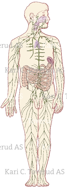 The lymphatic system with lymphatic vessels and organs in a male